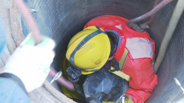 吳新炎從事管網(wǎng)修復(fù)工作有4年了,讓他連連稱小的這口井直徑不到60厘米,施工人員進(jìn)入后,整口井被遮擋得嚴(yán)嚴(yán)實(shí)實(shí)。吳新炎說(shuō),管道作業(yè)有風(fēng)險(xiǎn),一般一個(gè)人下井,三四個(gè)人在地面留守,每過(guò)一段時(shí)間,兩邊就要喊話一次,確保沒(méi)有異常。