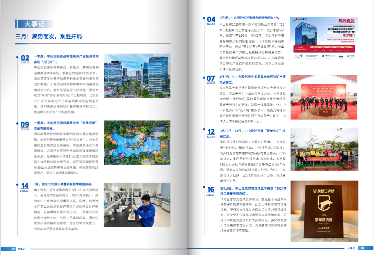 定格產(chǎn)業(yè)投資前線,捕捉到中山投控一季度產(chǎn)業(yè)投資“開門紅”,多管齊下布局戰(zhàn)略賽道的開拓之美;定格酒店康養(yǎng)業(yè)務(wù),捕捉到中山投控酒店康養(yǎng)業(yè)務(wù)乘“大橋”東風(fēng)、首季業(yè)績飄紅的融合之美……本期“集團(tuán)資訊”欄目,展現(xiàn)了中山投控緊扣“立足灣區(qū)、勇攀高峰”戰(zhàn)略藍(lán)圖,在產(chǎn)業(yè)投資、轉(zhuǎn)型升級(jí)等領(lǐng)域的多維突破。從年度會(huì)議“價(jià)值創(chuàng)造、降本增利”的精準(zhǔn)部署,到AI技術(shù)賦能培育新動(dòng)能的創(chuàng)新實(shí)踐,中山投控正以更高視野統(tǒng)籌發(fā)展,奏響高質(zhì)量發(fā)展奮進(jìn)強(qiáng)音。