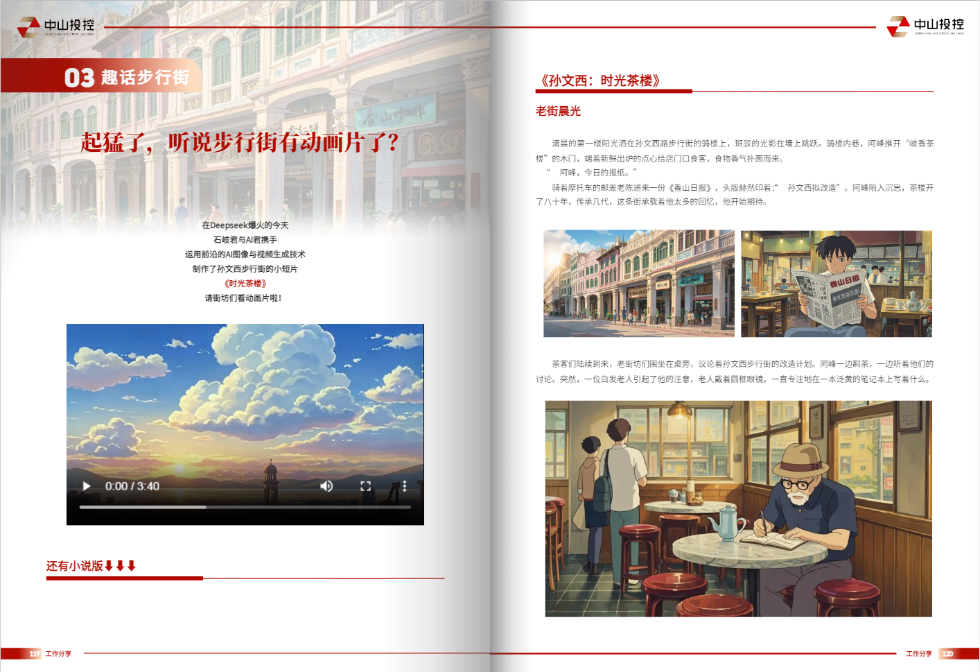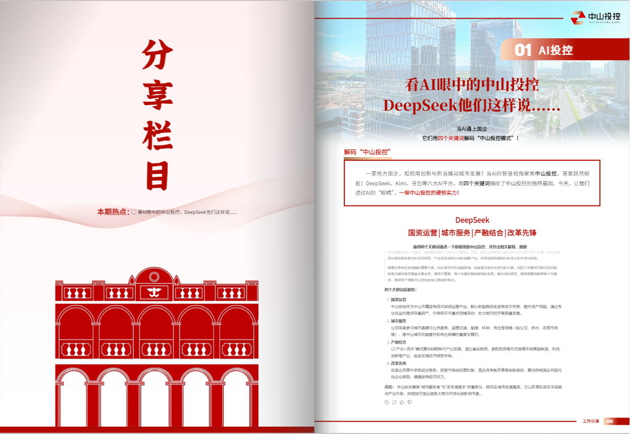 在“投控分享”欄目,我們?yōu)槟愠尸F(xiàn)中山投控在創(chuàng)新領(lǐng)域的多元探索。“AI 投控” 帶你走進(jìn) AI 眼中的中山投控,看 DeepSeek 如何解讀集團(tuán)發(fā)展密碼,解鎖科技賦能新視角;“趣話公用”用新奇的視角帶你發(fā)現(xiàn)中山公用水務(wù)的“隱藏法寶”,原來哪吒同款“風(fēng)火輪”“混天綾”在水務(wù)工作中有著別樣的體現(xiàn),感受公用事業(yè)的獨(dú)特魅力;“趣話步行街”則帶你探秘孫文西步行街的奇妙動(dòng)畫之旅,看老街如何在 AI 與創(chuàng)意的碰撞下煥發(fā)出新的活力;“AI 雍陌村”聚焦“百千萬工程”,帶你領(lǐng)略中山投控用 AI 為雍陌村繪就的“花花世界”,見證鄉(xiāng)村振興的創(chuàng)新實(shí)踐。在這里,創(chuàng)新與趣味交織,共同講述中山投控的精彩故事。